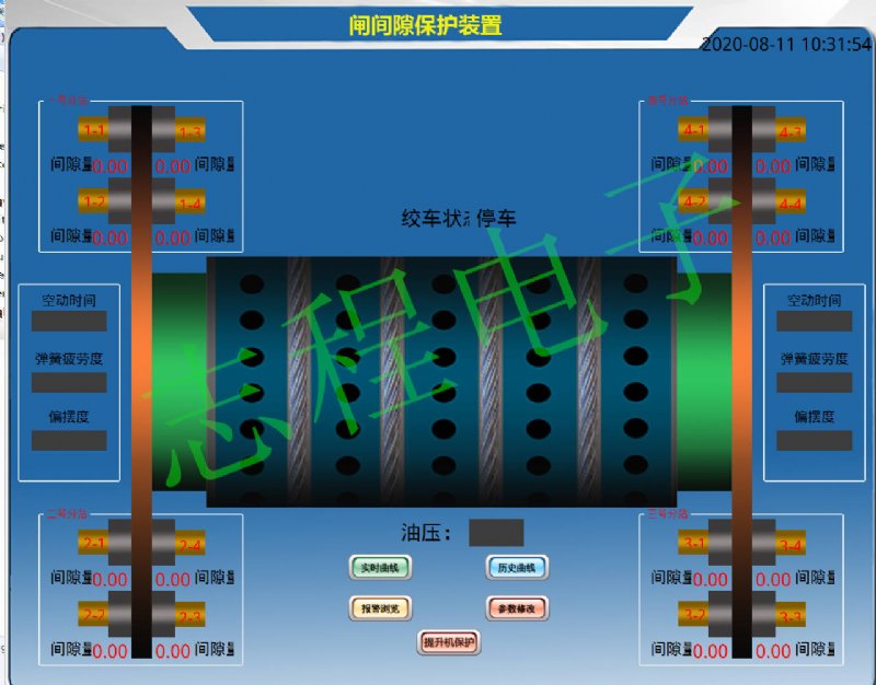 绞车运行参数监测装置是根据《煤矿规程》和《2020版煤矿安全生产标准化和评分要求》开发的,能够实时监测和显示提升机绞车的闸瓦间隙、闸瓦磨损、空动时间、油压参数、温度参数和振动参数等运行参数。当参数超过设定值时,设备发出声光报警,并可为下次启动提供锁定功能。