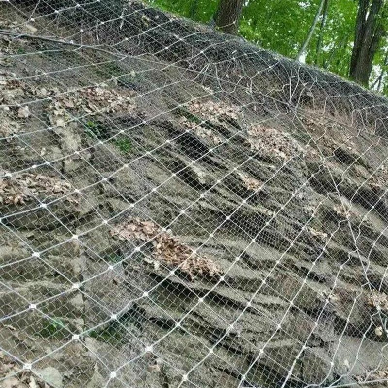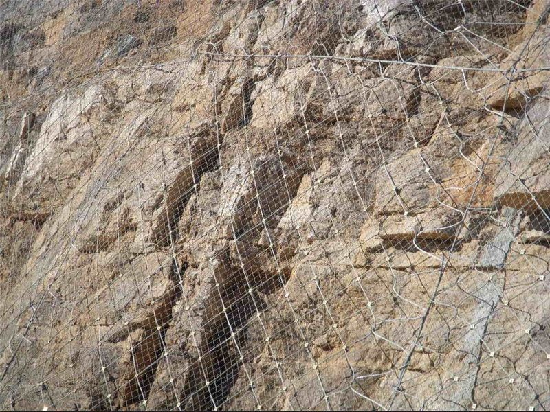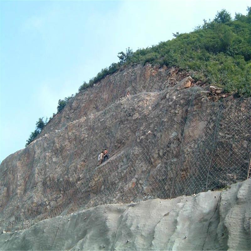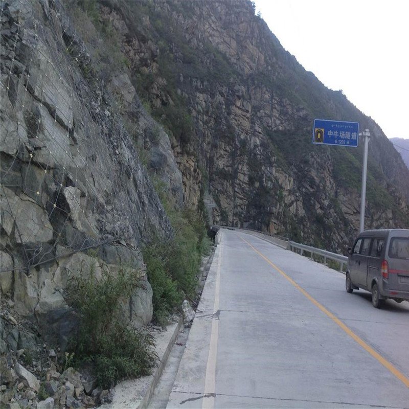 钢丝绳网为主的各类柔性网覆盖包裹在所需防护斜坡或岩石上,以限制坡面岩石土体的风化剥落或破坏以及为岩崩塌(加固作用),或将落石控制于一定范围内运动(围护作用)。被动防护是由钢丝绳网、环形网、(需拦截小块落石时附加一层铁丝格栅)、固定系统(锚杆、拉锚绳、基座和支撑绳)减压环和钢柱四个主要部分构成。钢柱和钢丝绳网连接组合构成一个整体,对所防护的区域形成面防护,从而阻止崩塌岩石土体的下坠,起到边坡防护作用。