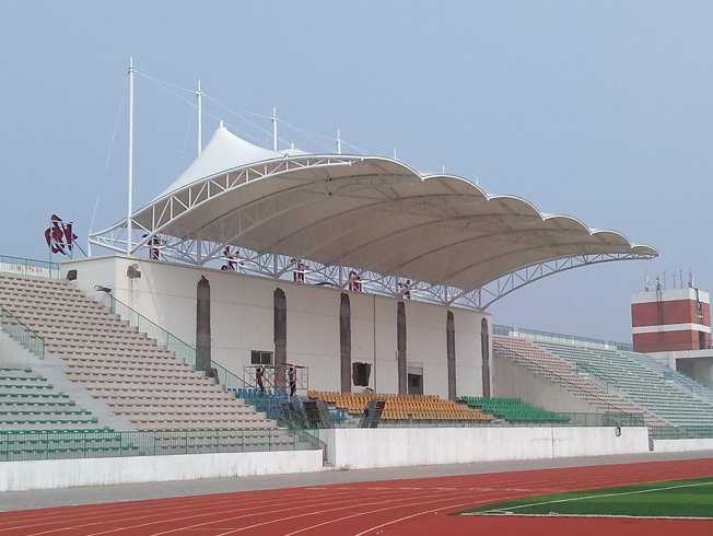 膜结构看台的特性:可使建筑师设计出各种张力自平衡、复杂且生动的空间形式。在一天内随着光线的变化,雕塑般的膜结构通过光与影而呈现出不同的形态。日出和日落时,低入射角度的光线将突现屋顶的曲率和浮雕效果,太阳位于远地点时,膜结构的流线型边界在地面上投入弯弯曲曲的影子。利用膜材的透光性和反射性,经过设计的人工灯光也可使膜结构成为光的雕塑。