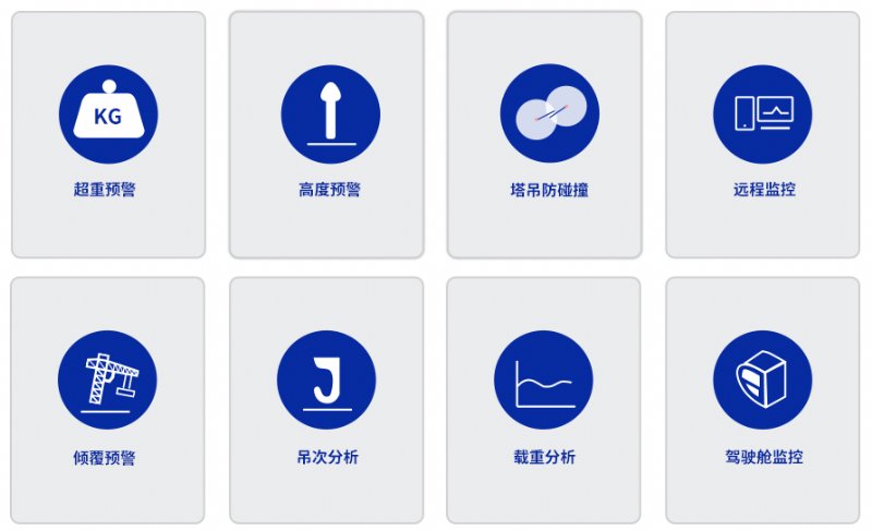 塔吊的大臂仰角、回转角和载重数据,数据在云平台上可视,对塔机间碰撞提供实时预警,并自动进行制动控制;对于给定的塔机,根据塔机的载重和幅度曲线,对每次吊装超载进行实时监控,预防塔机超重超载、倾覆等安全事故隐患。