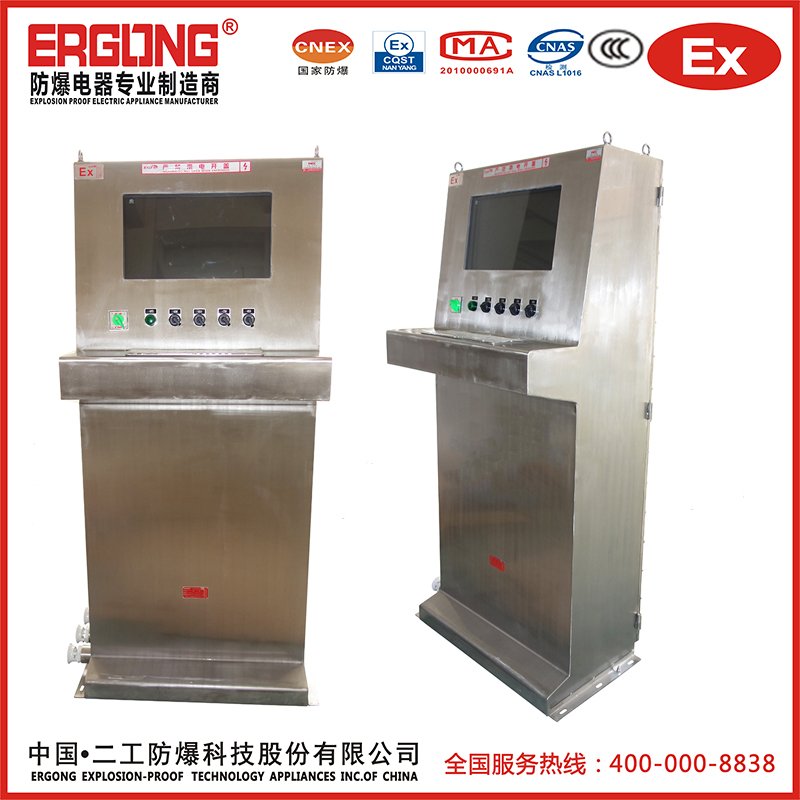 不锈钢材质制作,两种防爆形式相结合,防爆性能更加优越,适应能力更强。通过安装固定立柱即可将整个电脑安装在水平地面上,不需要另外的操作台面和安装支架。本实用新型结构紧凑,强度高,防腐性能优越,操作方式和普通电脑操作方式一样用键盘和鼠标进行操作,操作简单。