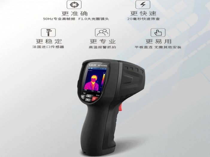 DT-870YS外接10.1英寸pad大屏,可实现多人同时测温。使用pad上预装的Thermalguard软件,可以在大屏上直接读取测量数据、通行人数、异常人数等。在筛选模式下测量范围为35℃~42℃,测量精度±0.5℃。