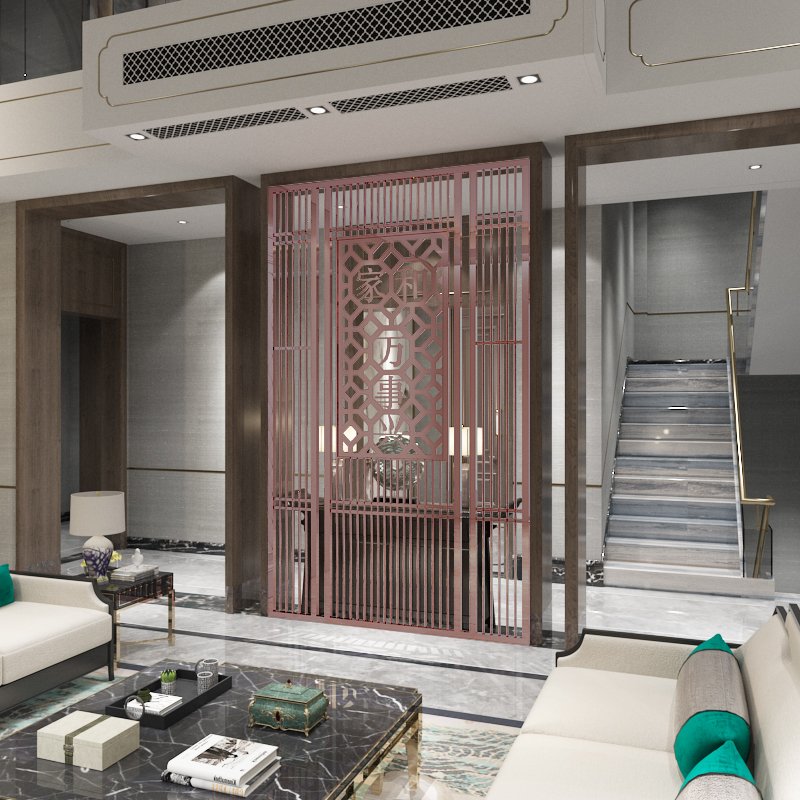 屏风是古人常用的划分空间的方式,在现代家装艺术中,设计师们运用自己的智慧与创意,在取其实用性的同时更加注重装饰效果,将屏风演绎出了更加别样的风情。古朴风格的不锈钢屏风常见于中式或新中式风格设计中,材质一般以玻璃,金属等为主,配以精致美丽的图案,不但具有良好的通风性和透光性,还能给居室带来一种古朴典雅的气氛。另外,屏风大的优点是移动方便,可以不时为家居变幻出新感觉。当业主在书房工作需要宁静工作时,可拉上