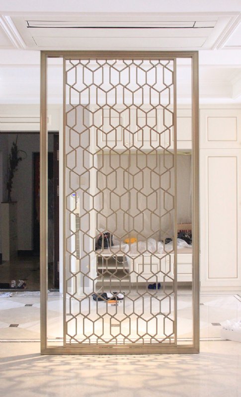 不锈钢屏风常见于中式或新中式风格设计中,材质一般以玻璃,金属等为主,配以精致美丽的图案,不但具有良好的通风性和透光性,还能给居室带来一种古朴典雅的气氛。另外,屏风大的优点是移动方便,可以不时为家居变幻出新感觉。当业主在书房工作需要宁静工作时,可拉上