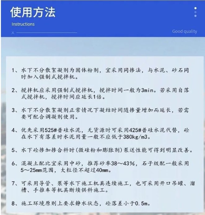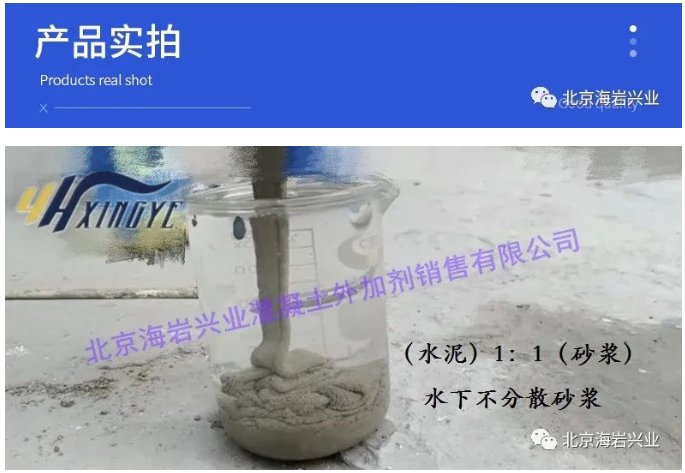 水下不分散混凝土同常规水下混凝土相比较,大大地简化了施工工艺,使混凝土水下施工陆地化,程度上降低了施工的风险性,并且该项技术还可使以往无法施工的水下薄壁、窄小和异型等特殊结构得以实现。水下不分散混凝土絮凝剂具有良好的水中抗分散性,在水中落下时不分散、不离析,水泥很少流失,环境。砼具有良好的流动性,水中浇注能自流平、自密实,无需水下震捣,简化了水下施工工艺。