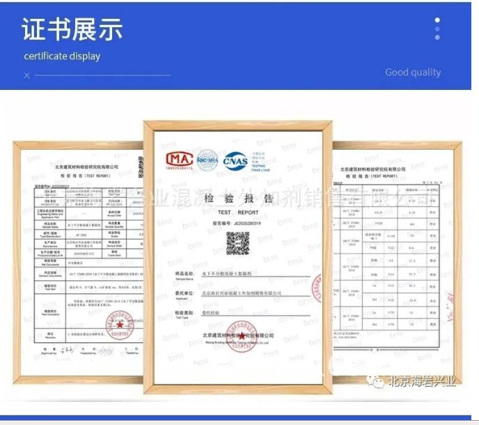 水下不分散混凝土絮凝剂可根据水下工程的需要配制C15~C40水下不分散混凝土,以满足不同施工性能的要求。水下不分散混凝土坍落度可达18~24cm,不泌水,不离析。初凝5~40h,终凝10~50h,凝结时间可调。抗渗可达S20以上,抗蚀系数不小于0.85。水下不分散混凝土絮凝剂同其它外加剂有较好的匹配性,掺加引气剂可配制D300抗冻融混凝土。对
