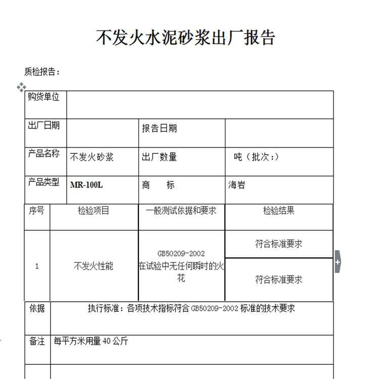 以上是不发火水泥砂浆的主要组成成分,另有特殊的外加剂保证砂浆的强度,抗裂性,无收缩,抗折性等
