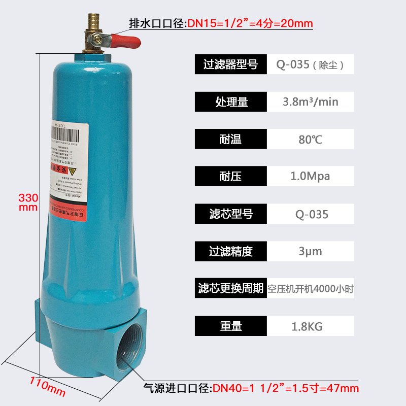 滤芯、排污部件等组成。当含有大量油和水固体杂质的压缩空气进入分离器后,沿其内壁旋而下,所产生的离心作用,使油水从汽流中析出并沿壁向下流到油水分离器底部,然后再由滤芯进行精过滤。因滤芯采用的是粗、细、超细三种纤维滤材折叠而成,具有很高的过滤效率(可达98%以上)并且阻力小,气体通