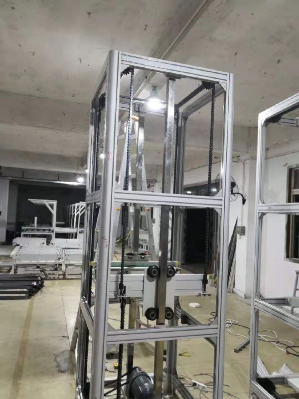 输送机启动输送作用,讲所需要的产品输送到升降机里面的升降台上的输送台上,上下往复升降后到达二楼或者楼下,再次通过感应后,将产品从升降台上的输送机输送到进出输送机上,进出输送机需要人工及时取放产品,在取放产品的同时也是通过感应装置后默契的配合升降台上的升降上下运行。