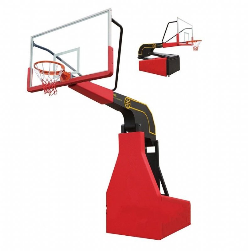 4、产品结构原理:电动液压篮球架采用自主研发微电脑控制系统,可实现篮球架伸臂升降,滚轮升降,遥控操作等功能。手动液压篮球架里面装有一个手动
