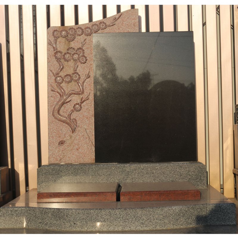 主碑的左侧采用印度红石材质,以浮雕技法雕出一株妙趣横生,美不胜收的梅花,梅花是花中之王“四君子”之一,寓意顽强、雅致和贞节的品性,代表着傲然挺立、高洁、谦虚品格的人。借助梅花之意,突出逝者是一位坚韧毅力,不屈不挠,生生不息的精神,也庇佑后代子孙幸福美满,平安长寿之意。
