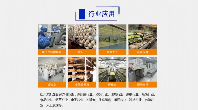 超声波加湿机,采用超声波高频振荡的原理,达到均匀加湿的目的,具有空气加湿、净化、防静电、降温、降尘等多种用途;既可以较大空间进行均匀加湿,也可对特殊空间进行局部湿度补偿,具有较高的使用灵活性。广泛应用于纺织,食用菌,电子车间,印刷行业等
