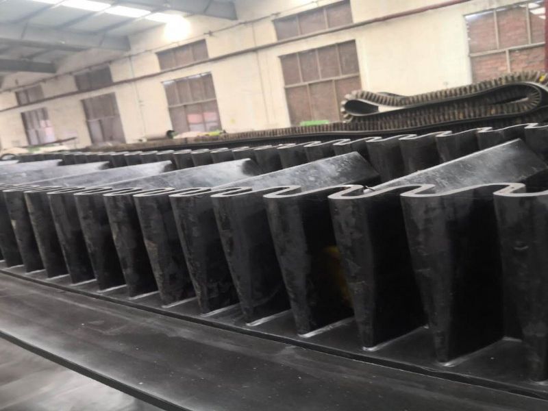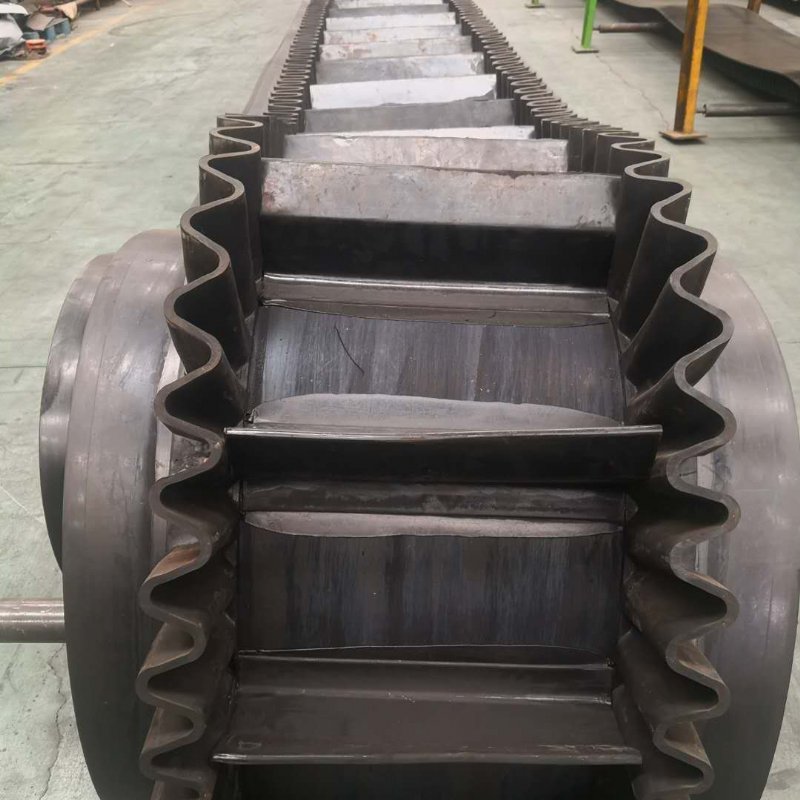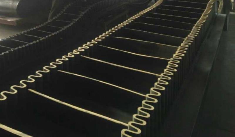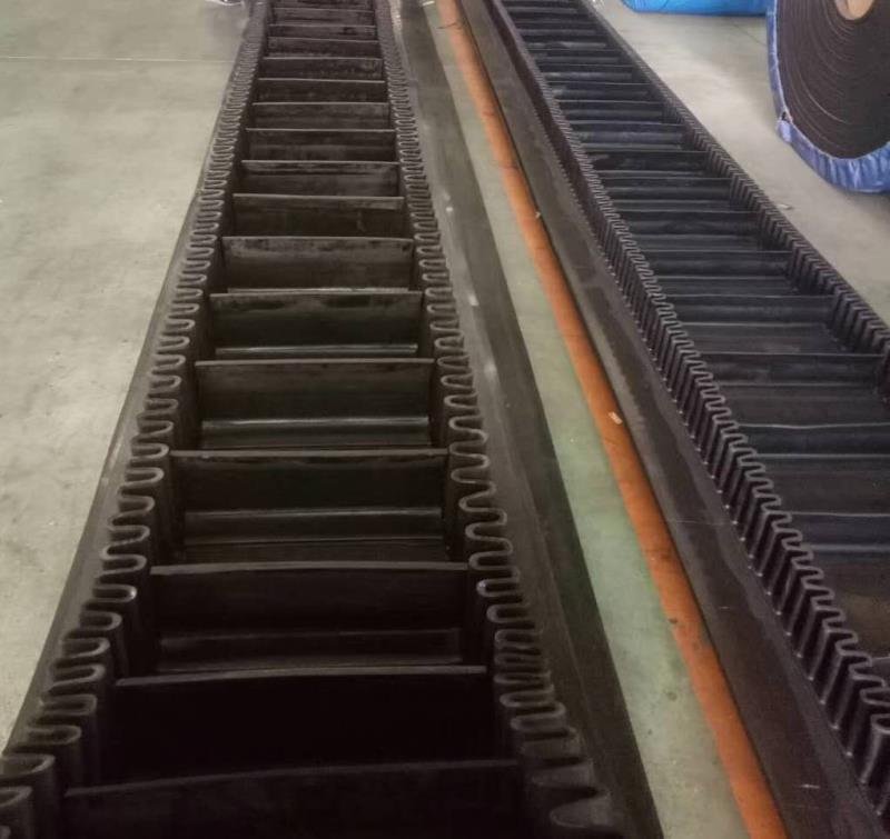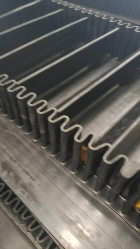 滚筒,档边设计成波纹状;横隔板的作用是承托物料,为了实现大倾角输送,采用T型TC型。档边和横隔板是用二次硫化的方法与基带连接的,具有很高的连接强度。用于输送易散落的粉状、粒状、小块状、糊状及液态状物料。其特点:适用于倾角0°~90°散装物料的输送;具有使用范围广、占地面积小、无转运点、减少土建投资、维护费用低、维修容易输送量大连续化、高效率、大倾角运输,操作安全,使用简便,,运费低廉,并能缩短运输距离,降低工程造价,节省人力物力等特点;解决了普通带和花纹带所不能达到的输送角度;还可根据使用环境,设计成完整、独立的输送系统,避免了间断输送和复杂输送的提升系统。可沿水平、倾斜、垂直和变角方向输送各种散装物料,从煤、矿石、