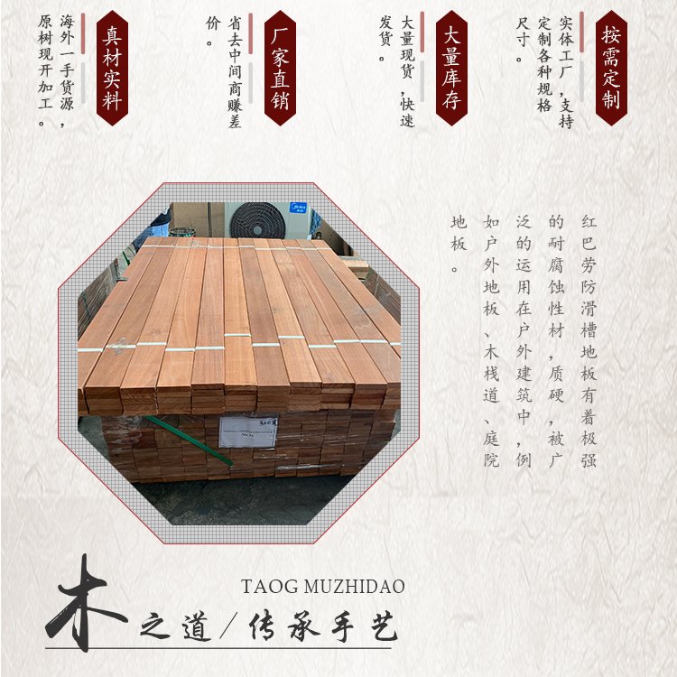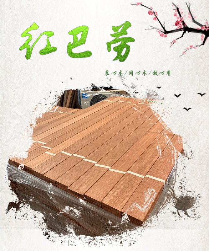 用途:巴劳木属天然环保防腐木,耐候性强,使用周期长,常被用于户外地板、园林景观、