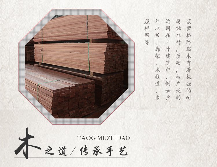 菠萝格防腐木还有着红木的一些特性,红木的稳定性、抗潮湿和白蚁能力都不弱。萝格根据其类型的不同有的还可以可加工为防腐木,用作户外的木材建筑、