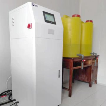 水箱和碱水箱于机器体内,安装占地面积更小,节省空间,美观大方。加载自动溶盐装置,盐箱配有自动溶盐搅拌功能,微电脑自动控制溶盐,无须盐水罐,无需人工配比电解剂溶液,使用操作更方面快捷。设备还具有≥7寸彩色触摸屏控制操作,每分钟生成2L酸化水、2L碱性水。生成器显示屏实时在线显示pH值、ORP值、有效氯以及电解电流,可附加其他工作状态指示数值信息,如累计运行时间,保证随时可监测酸化水的关键技术指标。配置