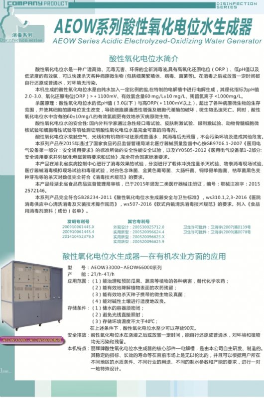 酸性氧化电位水是一种广谱高效、*无害、环保的全新消毒液,具有高氧化还原电位(ORP)、低PH值以及浓度的有效氯,可以快速杀灭各种病原微生物(包括细菌繁殖、病毒、真菌等)。在消毒之后或放置一定时间都自行还原成普通水,对环境*。