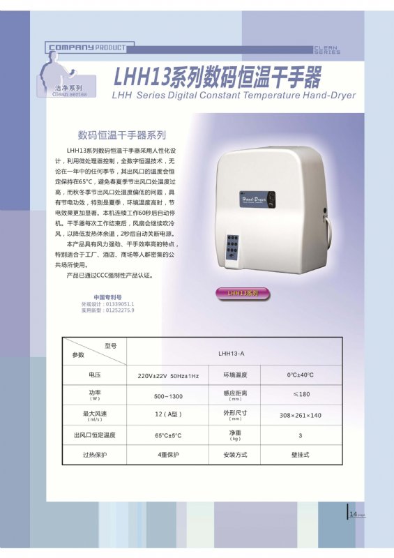 干手器采用人性化设计,利用微处理器控制,全数字恒温技术,无论在一年中的任何季节,其出风口的温度会恒定保持在65摄氏度,避免春夏季节出风口处温度过高,而秋冬季节出风处温度偏低的问题,具有节能省电的功效,也极大的节省运营成本,特别是夏季,环境温度高时,节电效果更加显著, 本机连续工作60秒后自动停机。