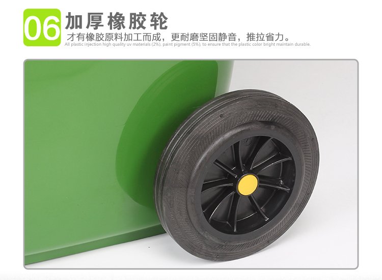 聚乙烯为原料一次注塑成型,在制作过程中注入高质量防晒紫外线原料,成品性能强度高,承受力大, 能耐酸耐碱、耐油污,*无味,清洁方便,堆放整齐,便于管理。桶盖填充严密,桶体日久不变形,桶体结构不会变脆弱和变形。橡胶轮在使用过程中灵活自如,无障碍干涉。桶体颜色采用国际标用颜色色系标准。制造工艺上,在吸收国外进口
