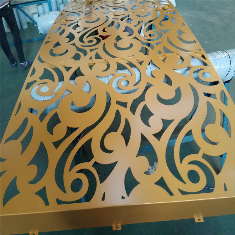 合金板,通过电脑数控雕出各种艺术花型,再平面板经过数控折弯技术将板边折边成建筑装饰所需要的形状,板面经烤漆颜色喷涂,喷涂后的艺术雕花