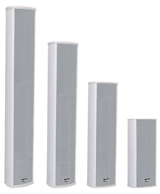 60W、80W、100W功率数字网络音柱外观与30W、40W的音柱不同,分别内置了2只、3只、4只6.5寸大功率全频布边防水纸盆单元,型号对应HQ-E4060、HQ-E4080和HQ-E4100,音柱工艺同样采用白色铝合金箱体、ABS上下盖、铝合金网罩,下盖为内沉式阶梯防雨结构设计。