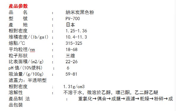 炭黑色粉,是一隻高性能有機顏料,耐熱性高達300度,耐光性達8級,耐遷移性5級,著色力強、耐熱性高、耐曬性能優良、耐溶劑性、耐遷移性、優良的物理和化學性能、遮蓋力強、色澤柔和、性能穩定、無毒、耐候性能、耐酸、耐鹼、耐熱、高分散性、抗靜電、高透明、高光澤、抗老化、耐高溫、耐遷移等優點。應用廣泛,在塑膠、