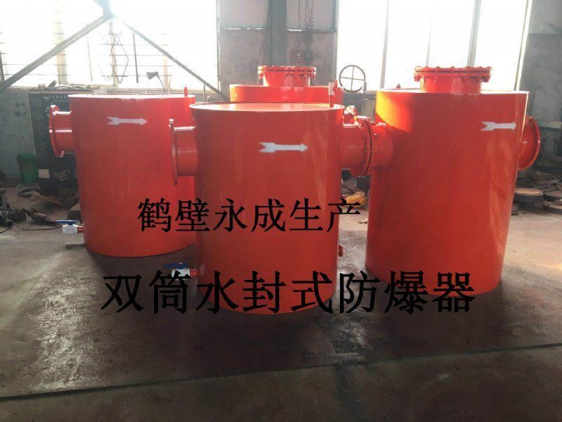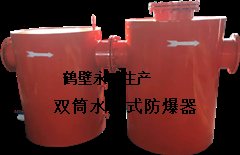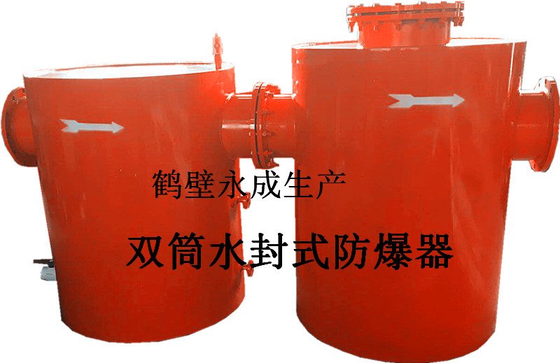 双筒水封式防爆器采用双罐结构,其水封水位观测直观、能够快速有效排污、操作简单、连接方便、安装防护性好、耗水量小且水封水位恒定、工作阻力稳定、泄压部件承压强度大等优点,并形成大、中小系列产品、满足不同客户的要求。