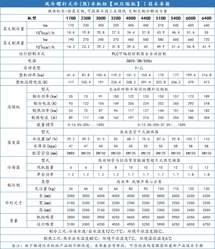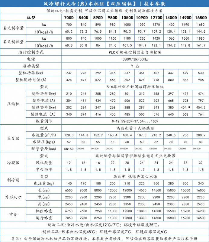 【1】制冷工况:冷冻水进/出水温度12℃/7℃;环境干球湿度35℃。