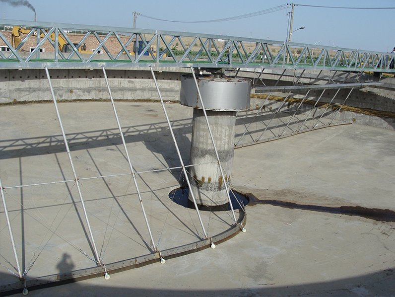 工作桥由安装在外围的驱动机构驱动,并围绕安装在水池中心的桥墩上的中心支架旋转。在旋转过程中,安装在工作桥上的一组刮泥机将沉积在池底的污泥刮到池中心的泥浆池中。同时,液面上的浮渣集中在刮渣器和周围渣堰形成的锥形区域,部分浮渣被刮到集渣斗排出池外。