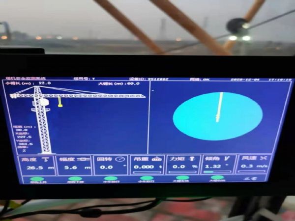 设备由安装在塔机驾驶室内的主机和相关传感器组成的一套安全监测仪器,该系统包含环境风速监测、塔机倾斜度监测、实时吊重、实时力矩、小车幅度检测、吊钩高度检测、大臂转向检测、区域禁行限制、塔群碰撞功能、历史数据存储、远程数据传输、驾驶人员身份识别、GPS 定位、UPS 供电等各项功能。配备的大尺寸显示屏可以用图文并茂直观的显示出塔机的工况参数,同时真人语音报警,让驾驶员有的放矢,为塔机安全保驾护航。