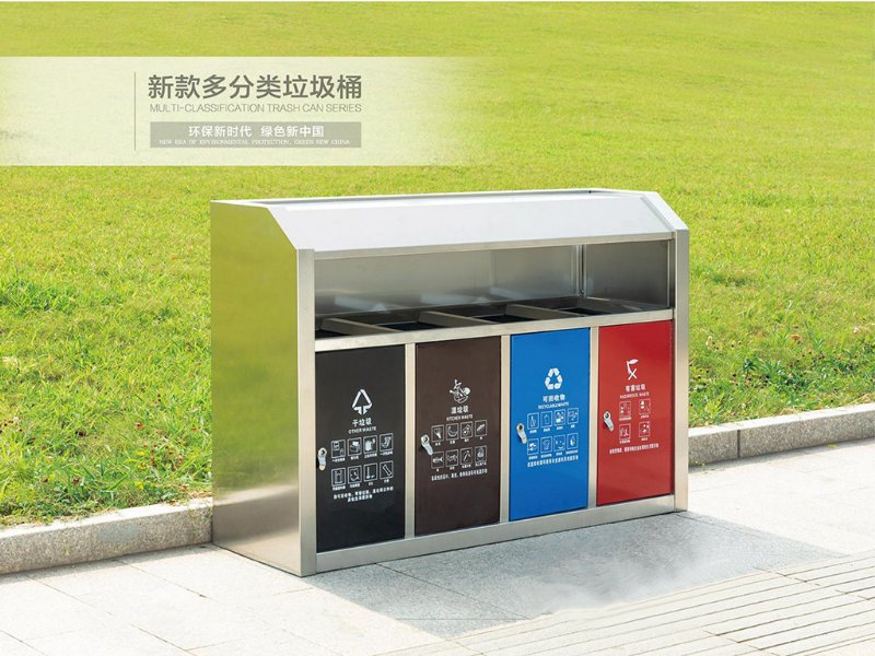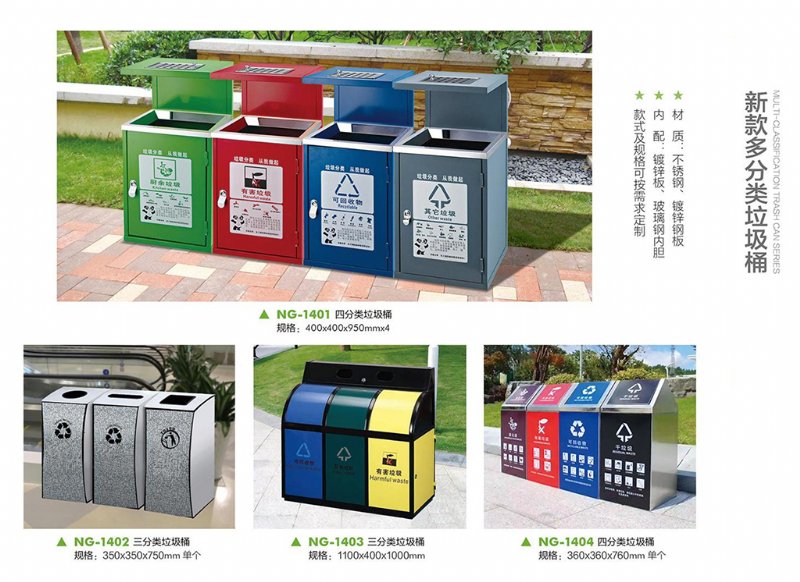 不锈钢垃圾桶、陶瓷垃圾桶、木质垃圾桶、水泥垃圾桶和纸浆垃圾桶等等。就开启方式有敞口式、揭盖式、踩踏开盖、感应式(红外线)等。