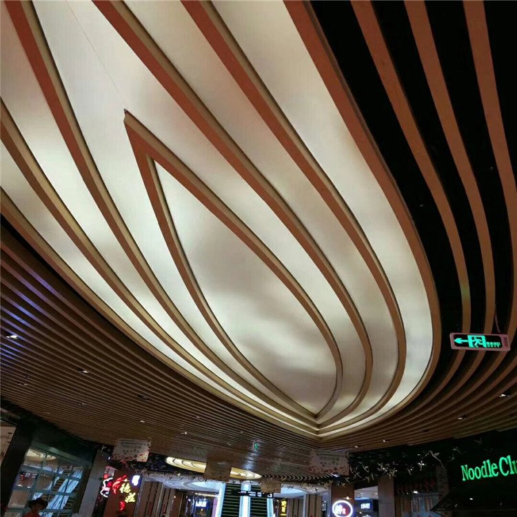 吊顶圆弧造型铝板,重量轻、立体感强、防水、防污、防火、防蚀、耐用不生锈、加工性能好、维护费用低、板面可加工成冲孔、雕花、镂空的各种艺术花型弧形及异形板,装饰更具有时尚的栖息,并且可以使建筑物更具高贵典雅的风格。