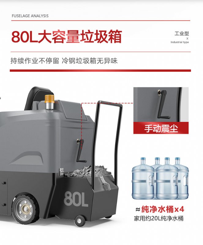 过滤网堵塞问题;驾驶型扫地机、喷雾抑尘、80L大容量、适用地面多样(工厂/车间/仓库/街道)。