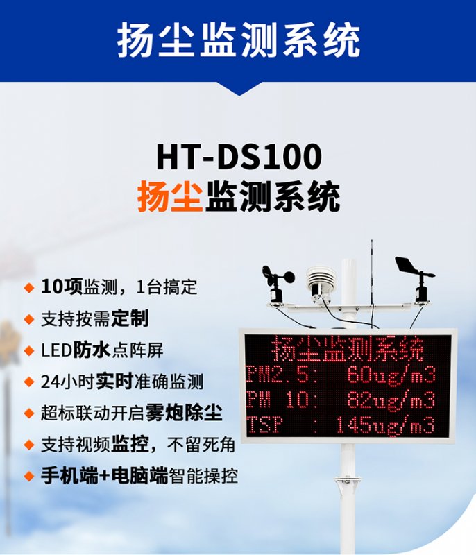 HT-DS100 系列扬尘监测系统是一套集成颗粒物和气象参数的在线监测终端,主要应用于在建工程、居民区、商业区、道路交通、施工区域等场所的环境空气质量在线实时监测。