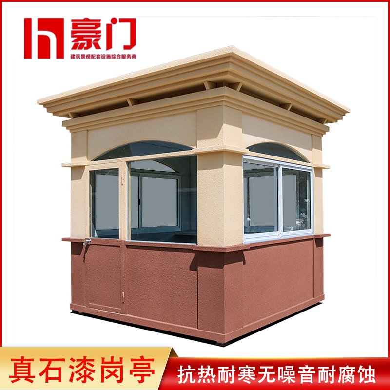 装修后的建筑物,具有真实的自然色泽,给人以高雅、和谐、庄重之美感,适合于各类建筑物的室内外装修。特别是在曲面建筑物上装饰,生动逼真,有一种回归自然的效果。真石漆岗亭具有防火、、耐酸碱、耐污染。、无味、粘接力强,等特点,能有效地阻止外界恶劣环境对建筑物侵蚀,延长建筑物的寿命,由于真石漆岗亭具备良好的附着力和耐冻融性能,因此适合在寒冷地区使用。