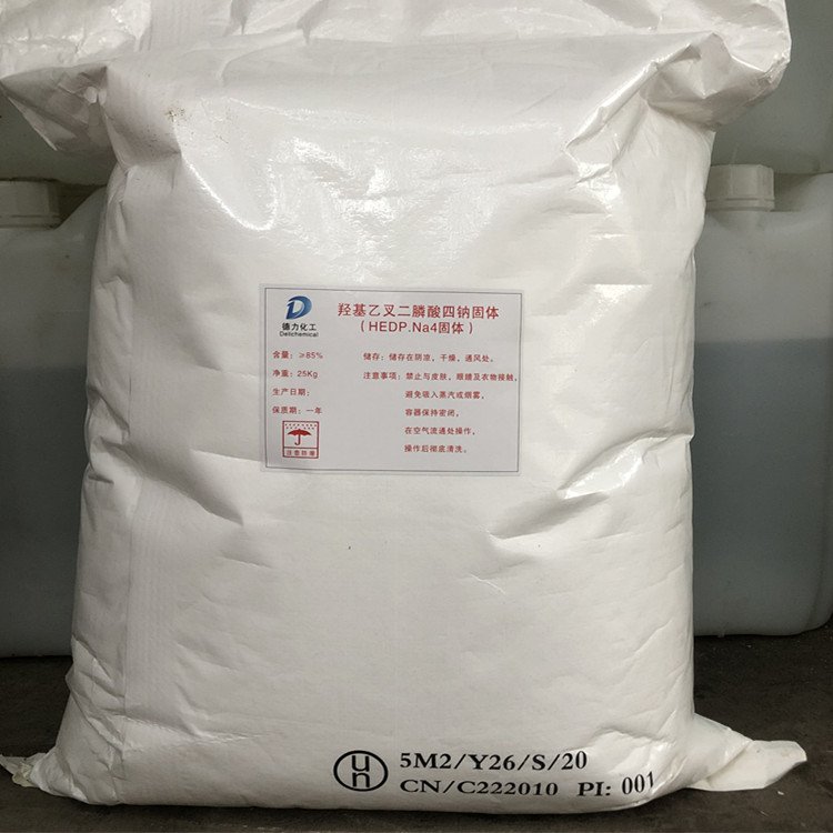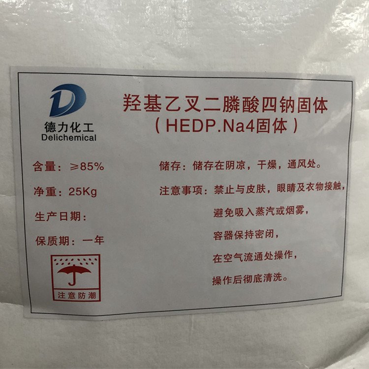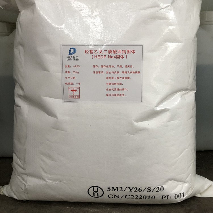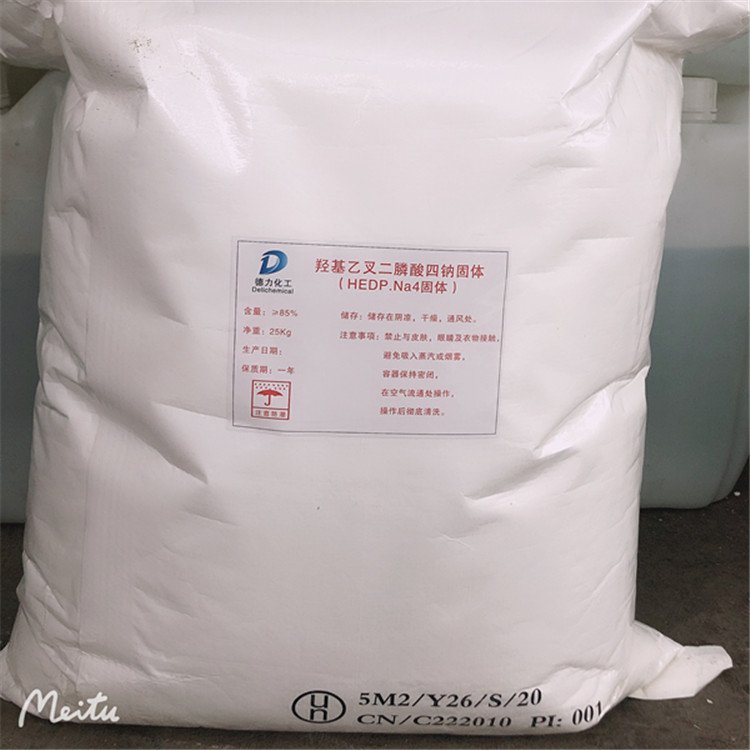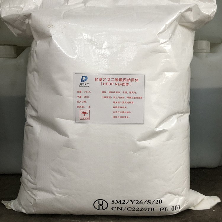 HEDP.Na4为白色粉末固体、易溶于水、不吸潮,方便运输,适用于严寒条件下使用。HEDP.Na4属于有机膦酸盐类阻垢缓蚀剂,能与铁、铜、锌等多种金属离子形成稳定的络合物,能溶解金属表面的氧化物。在250℃下仍起良好的缓蚀阻垢作用。