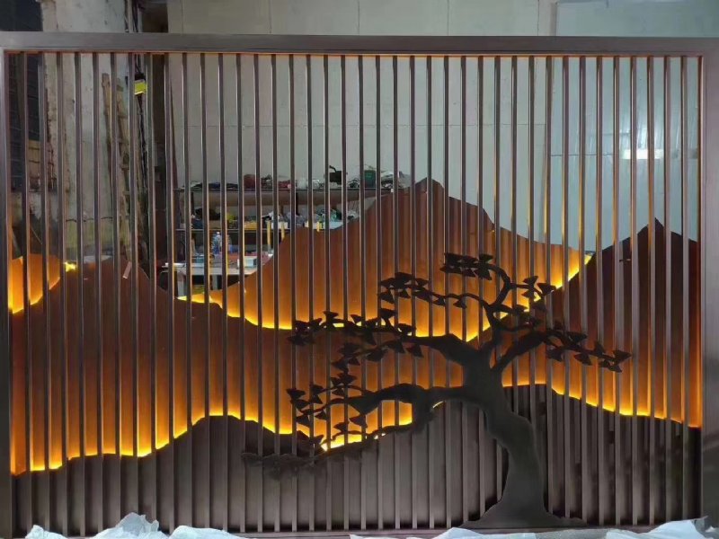 不锈钢屏风隔断新中式假山轻奢定制山水镂空雕花工艺背景墙玄关画