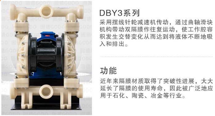 减速机传动,通过曲轴滑块机构带动双隔膜作往复运动,使工作腔容积发生交替变化从而达到将液体不断地吸入及和排出。同时,近年来隔膜材质取得了突破性进展,大大延长了隔膜的使用寿命,因此被广泛地应用于石化、陶瓷、冶金等行业。泵体主要结构材质分别有如下几种:铸钢、球铁、铝合金、塑料PP聚丙烯、氟