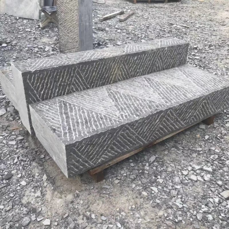 本公司主要加工销售青石台阶石;青石踏步石,青石仃步石等。青石台阶石使用广泛,一般是条石组成,常用的有錾道青石台阶、剁斧青石台阶、仿古青石台阶、古建筑大门入口处上下台阶石、楼梯台阶式等、办公大楼台阶石、景区台阶等。仿古建筑中不可缺少的青石台阶石和阶沿石及垂带石,原来古建中大部分都是采用青石台阶石和垂带石,因为青石材质铺装出来的古朴味道,更是我们现代人的喜爱,按照古建营造法式的做法,台阶石要出来单个数字,比如三步台阶是常用的,而没人采用四步的分法,台阶平面的铺设也要讲究对中轴线的原则,比如三步台阶,*下面可以分为二块石材,中间分为三块石材,*上面再分为二块石材,这样就可以对中缝而不是象现在铺设的一条线上去。