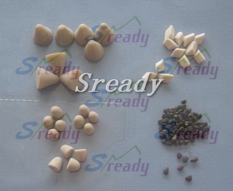 3、有正三角形研磨石,斜三角形研磨石,斜圆柱形研磨石,球形研磨石,椭圆柱型研磨石、菱形研磨石、以及各种不规则研磨石。
