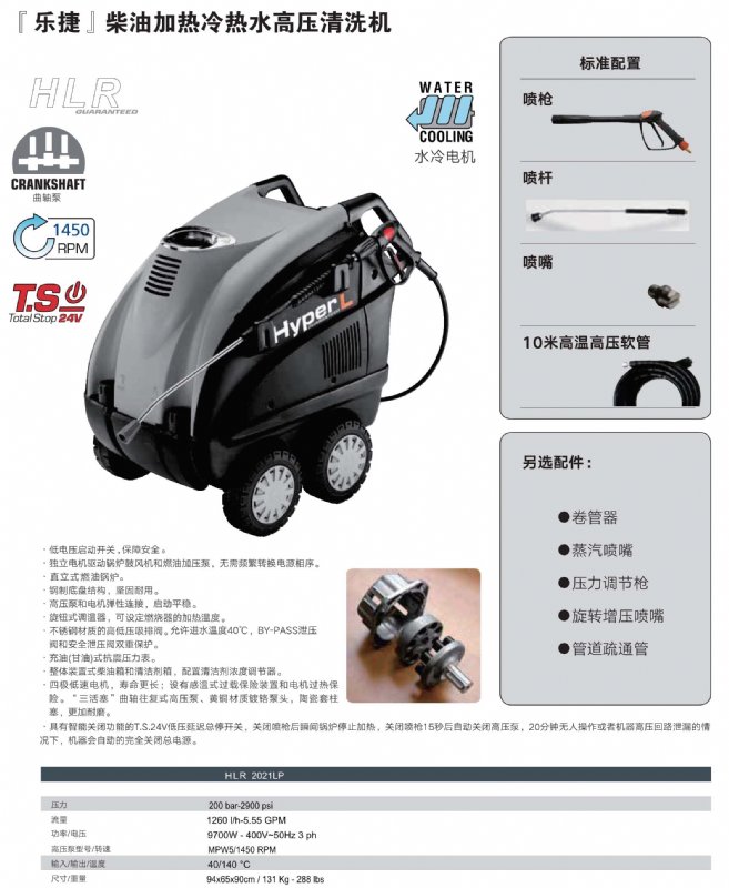 清洗机HYPER2021是一款大型的高压热水清洗机。它是一款原装意大利进口的清洗机,体积紧凑,配有四个大的实心轮子,移动方便。工业级别的曲轴泵,