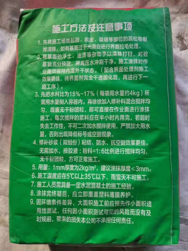 4、修补砂浆(双组份)粘结、防水、抗空鼓效果更佳。无需加水,按胶液:粉料=1:6比例进行搅拌均匀,无干粉团粒,方可正常施工。