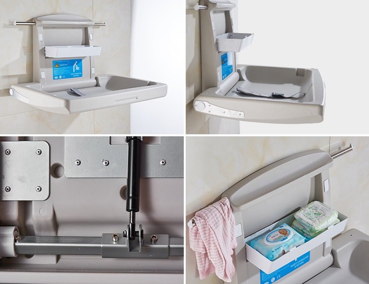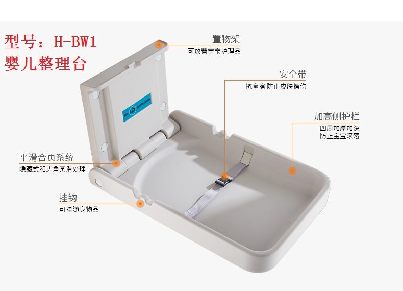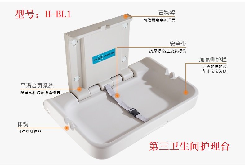 护理台主要是在公共场所装置的便捷设备,又叫婴儿打理台,婴儿换尿布台,婴儿尿布台等。它可以提供父母和宝宝温馨的服务,在顾客需要给孩子整理衣服、换尿布时,可将婴儿平放在整理台上面,方便母亲为宝宝换尿。婴儿整理台采用抗霉、抗菌之高品质材质一体成型,特殊圆角设计,安全可靠。台面宽大,配有可调整的