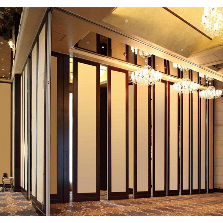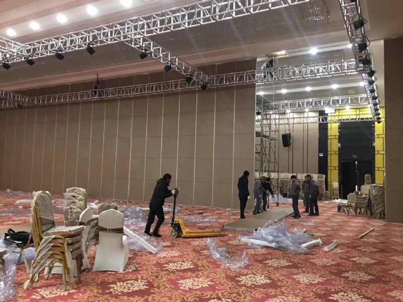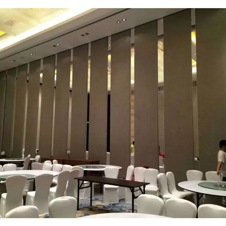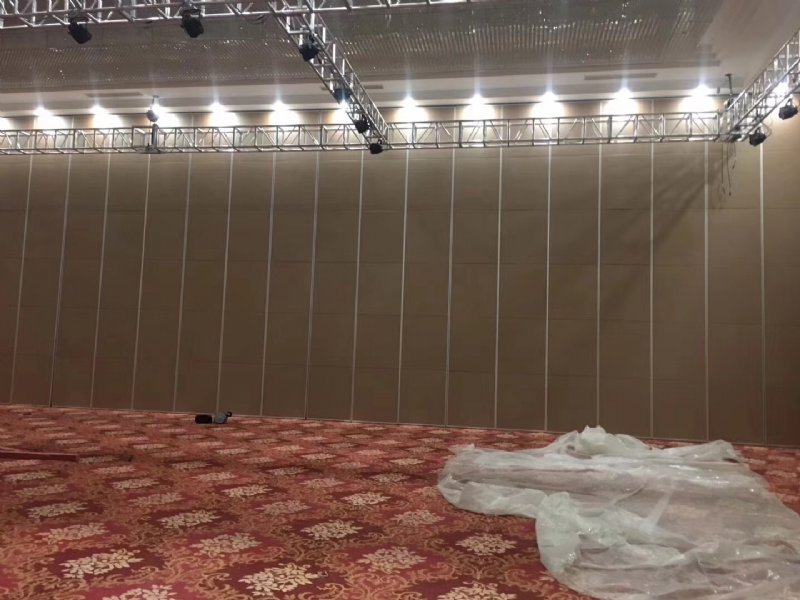 珠海宴会厅重型活动隔断推拉隔音墙主要分为顶部的轨道和墙板两大类,地面不需安装轨 道工序更为省事方便,同时工期也相对短。整体来说这种隔断便捷、经济、 实用因此在装修时人们常常选择它来使用。