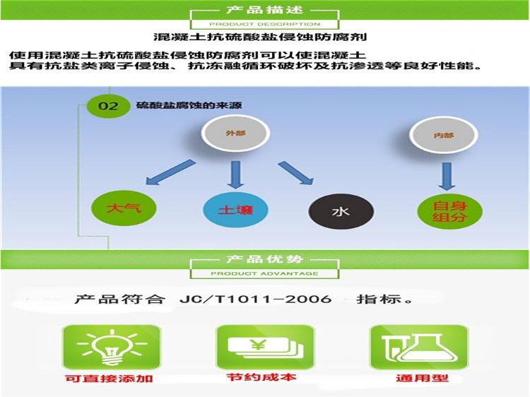 混凝土抗硫酸盐类侵蚀防腐剂是在混凝土搅拌时加入的,用于抵抗硫酸盐、盐类侵蚀性物质作用,提高混凝土耐久性的外加剂,称为混凝土抗硫酸盐类侵蚀防腐剂。简称抗硫酸盐外加剂执行标准:JC/T1011-2016;1、在硅酸盐类水泥