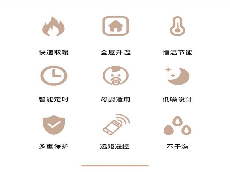 8、产品特点:·定时功能;·安全童锁设定;·过热保护;·倾倒断电保护;·格栅保护;·稳固支架;·温度可控;·开机即热不需等待;·运行无风无光无噪音;·远红外功能。