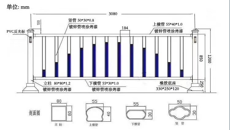 我厂生产的市政护栏以镀锌钢为原料,产品表面采用粉末喷涂处理,清洁方便,耐污防腐,无需保养。高温固化技术,令护栏有了优异的抗撞击性能,质量有保证。