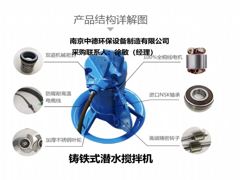 搅拌机采用直联式结构,能耗低,效率高;叶轮通过精铸或冲压成型,精度高,推力大,外型美观流畅,结构紧凑。