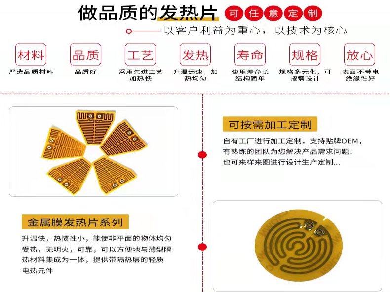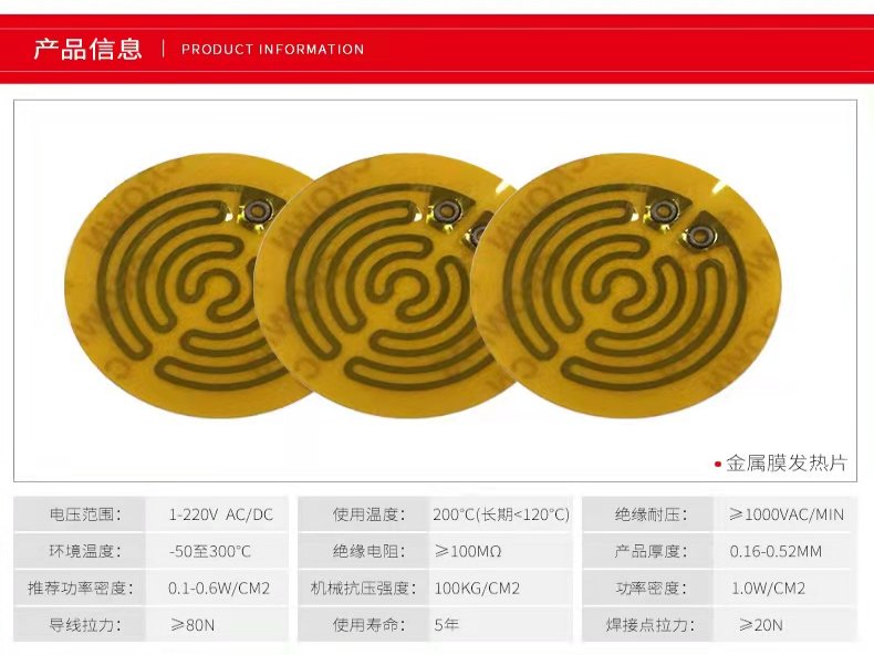 PI金属电热膜特点:与传统的电加热元件比较,金属电热膜具有以下的优点:1、所占空间极小;重量极轻;厚度极薄(一般小于0.1mm)。2、极其柔软,其小弯曲半径仅为0.8mm左右。3、形状及大小极其灵活,尤其适合于制作面积极小的柔性电热膜元件。4、采用面状发热方式,容许表面功率密度,大可达到7.8 W/cm2。因此,本产品系列具有加热均匀性能更好,加热速率更快的特点。5、在不同面积部位可满足不同的加热功率要求和加热温度要求,可按设计要求,实现在加热面上的温度分布。6、热惯量小,温度控制精度高,速度快。7、作为保护层的绝缘薄膜具有极低的饱和蒸汽压,放气性极低,同时具有的抗化学腐蚀性能,抗菌性能以及抗辐射性能。因此,本电热膜系列产品适用于真空环境、与油及大多数化学品(如,酸性、化学溶剂、一般的碱液)接触的环境。8、可以方便地与薄型