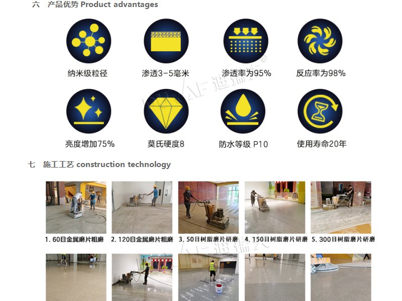 混凝土渗透型液体硬化剂是一种无色、无味的绿色环保水性透明液体材料,能快速有效渗入混凝土地面内部,其主要有效成份与混凝土中的钙、镁离子发生一系列复杂的化学反应,生成不膨胀、不收缩、性质稳定的化学产物,其产物填充了混凝土基面内部的毛细孔,形成一个致密坚固的实体,高效密封硬化混凝土基面,提高混凝土地基面的硬度与强度,通过研磨抛光工艺,让混凝土基面耐磨、防尘、抗老化。